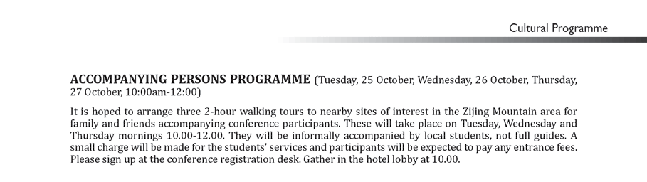 | 2:00pm - 6:00pm | Excursions in and around Nanjing These are included in the conference and accompanying persons' fees and are likely to include: 1. Zijin Mountain (Purple Mountain) area, including the Ming Tombs, Zhongshan Mausoleum (walking tour) 2. Confucius Temple area, including the Old Examination House, Confucius Temple, traditional riverside streets, downtown Nanjing 3. Zhonghua Castle and Zhanyuan Garden 4. Nanjing Massacre Museum and Nanjing Silk Brocade Museum 5. Nanjing Museum and Crow Temple 6. River-Looking Building and Jinghai Temple Sign up for the excursion of your choice at the Registration desk in Nanjing; first come first served! |