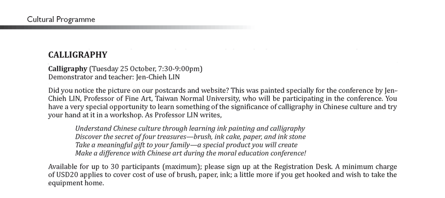 | 7:30pm - 9:00pm | Calligraphy Demonstrator and teacher: Jen-Chieh LIN |