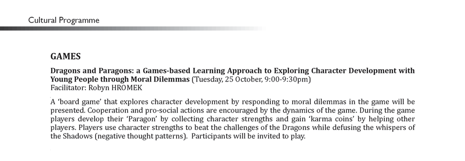 | 9:00pm - 9:30pm | Dragons and Paragons: a games-based Learning Approach to Exploring Character Development with young People through Moral Dilemmas Facilitator: Robyn HROMEK |