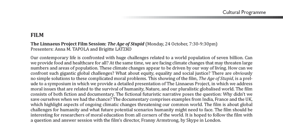 | 7:30pm - 9:30pm | The Linnaeus Project Film Session: The Age of Stupid Presenters: Anna M. TAPOLA & Brigitte LATZKO |