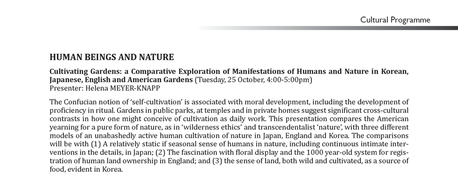 | 4:00pm - 5:00pm | Cultivating Gardens: a Comparative Exploration of Manifestations of Humans and Nature in Korean, Japanese, English and American Gardens Helena MEYER-KNAPP |