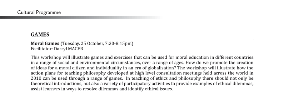 | 7:30pm - 8:15pm | Moral games Facilitator: Darryl MACER |