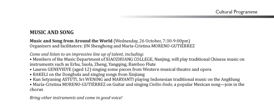 | 7:30pm - 9:00pm | Music and Song from Around the World Organisers and facilitators: JIN Shenghong & María-Cristina MORENO-GUTIÉRREZ Come and listen to an impressive line-up of talent, including: Members of the Music Department of XIAOZHUANG COLLEGE, Nanjing Lauren GENEVIEVE (aged 12) Western musical theatre and opera BAKELI on the Dongbula and songs from Xinjiang Sri WENING and MARYANTI on the Angklung, accompanied by Kun Setyaning ASTUTI María-Cristina MORENO-GUTIÉRREZ on Guitar and Mexican song Bring other instruments and come in good voice! |