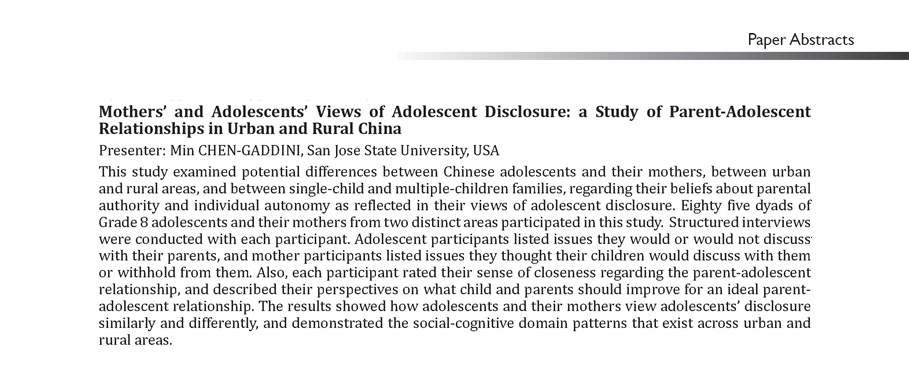CHINESE MORAL SOCIALISATION Mothers' and Adolescents' Views of Adolescent Disclosure: a Study of Parent-Adolescent Relationships in Urban and Rural China Min CHEN-GADDINI Gaining New Insights into guan jiao (管教) in Chinese Moral Socialisation Xiao-lei WANG The Effects of Ancestral Parenting Practices on the Moral Development of Chinese Three-year-Olds Darcia NARVAEZ |