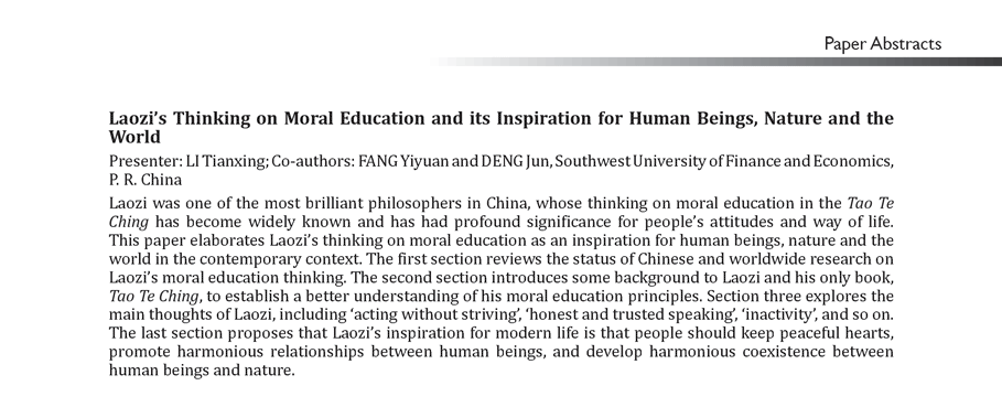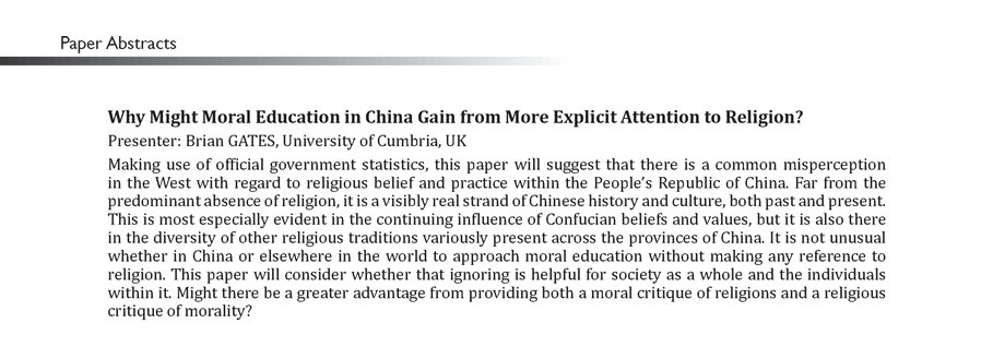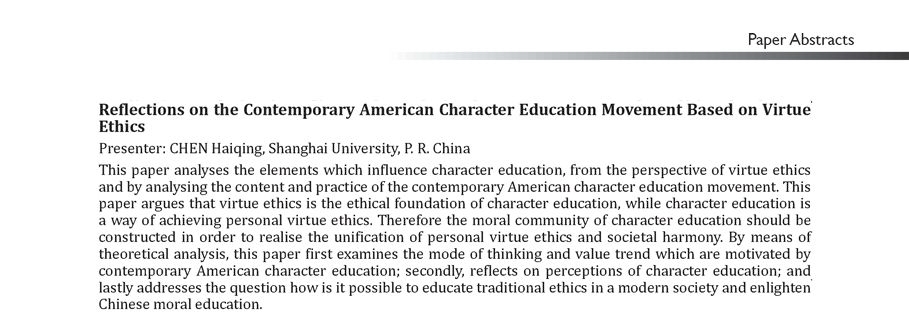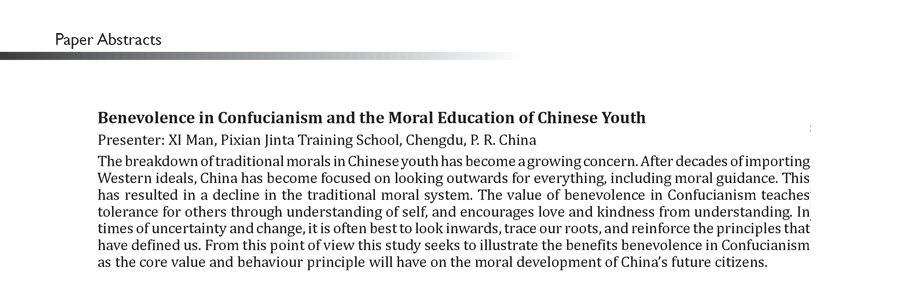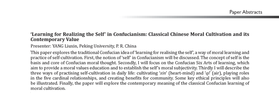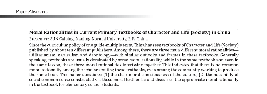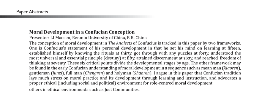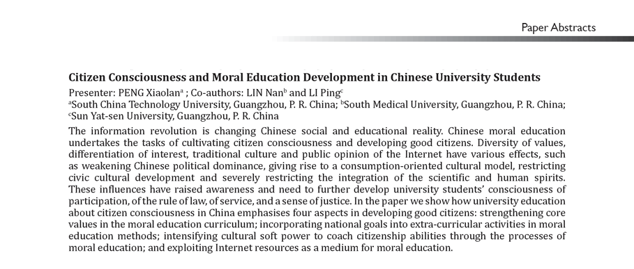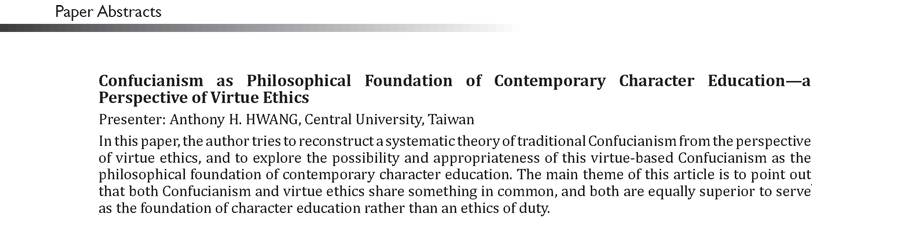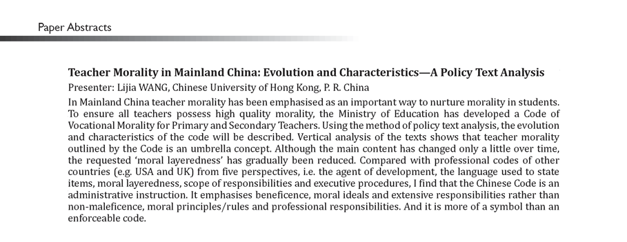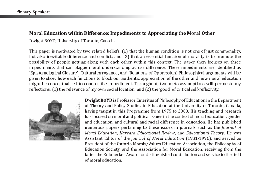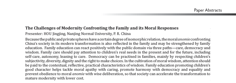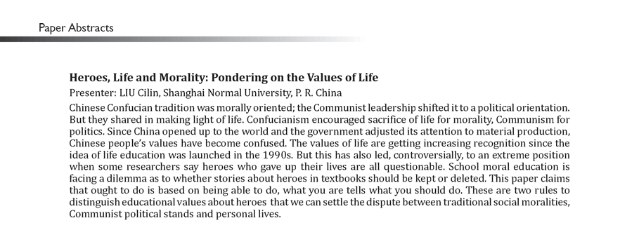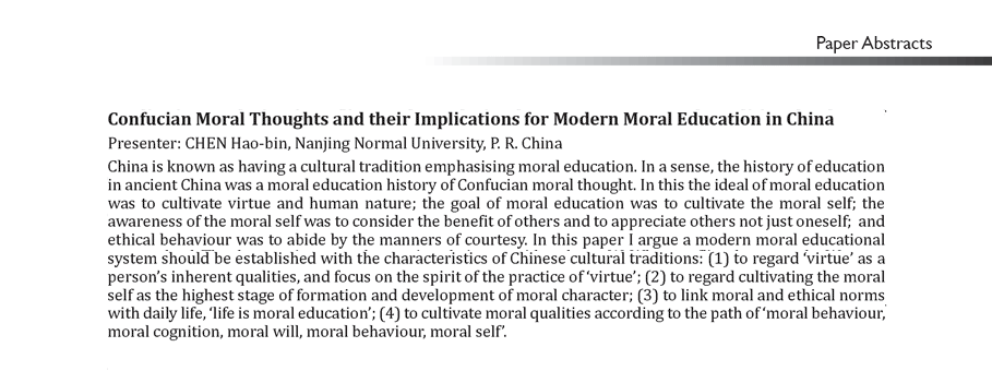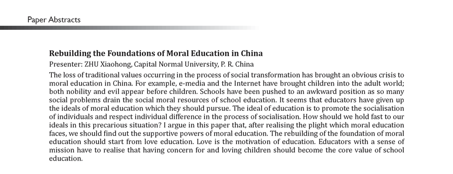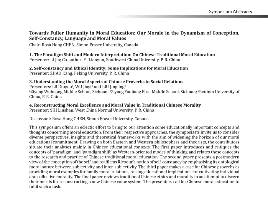 TOWARDS FULLER HUMANITY IN MORAL EDUCATION: OUR MORALE IN THE DYNAMISM OF CONCEPTION, SELF-CONSTANCY, LANGUAGE AND MORAL VALUES The Paradigm Shift and Modern Interpretation: On Chinese Traditional Moral Education LI Jia Self-constancy and Ethical Identity: Some Implications for Moral Education ZHAO Kang Understanding the Moral Aspects of Chinese Proverbs in Social Relations LIU Xuguo, WU Jiayi and LIU Jingjing Reconstructing Moral Excellence and Moral Value in Traditional Chinese Morality SHI Liushan Discussant: Rosa Hong CHEN |