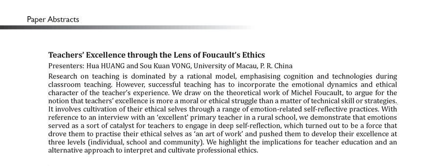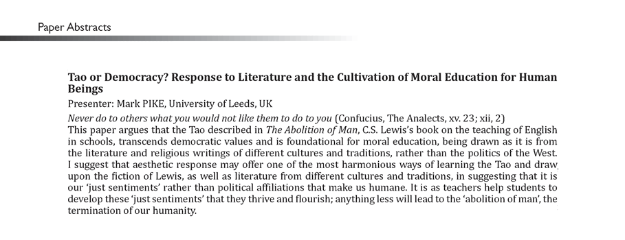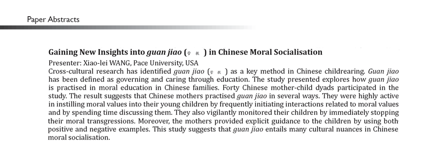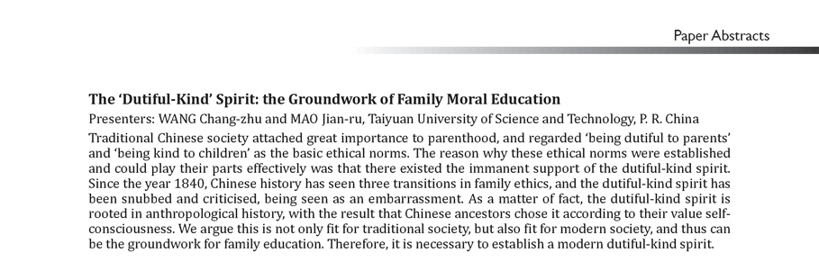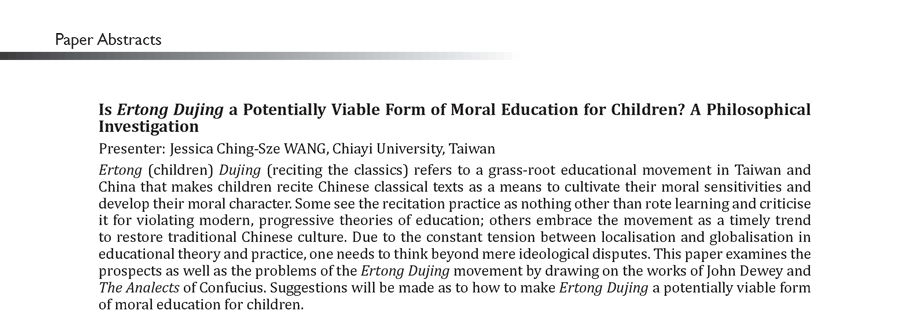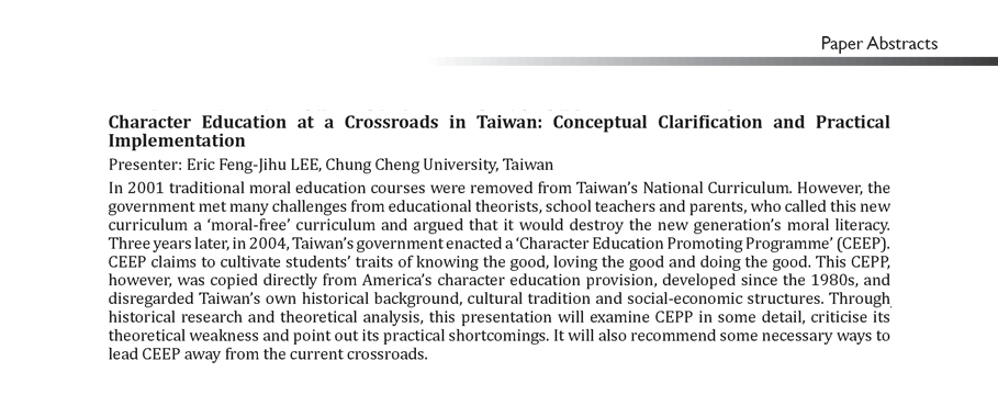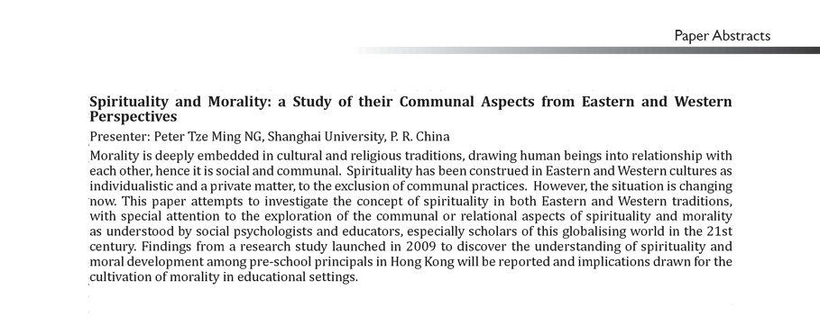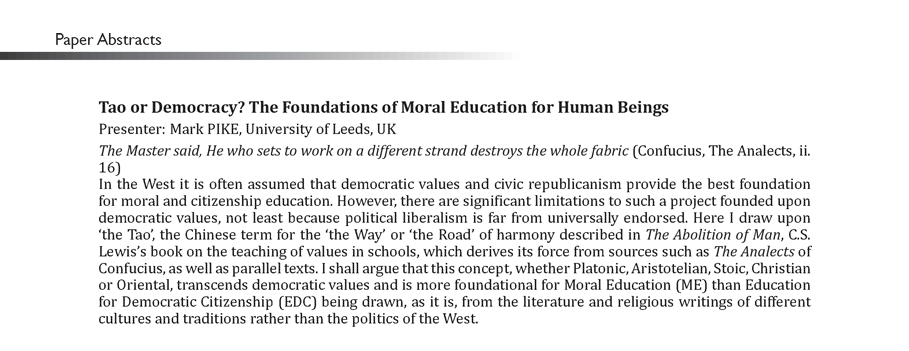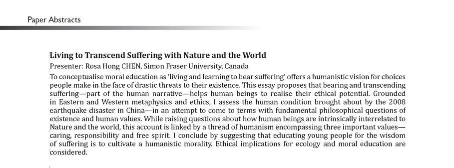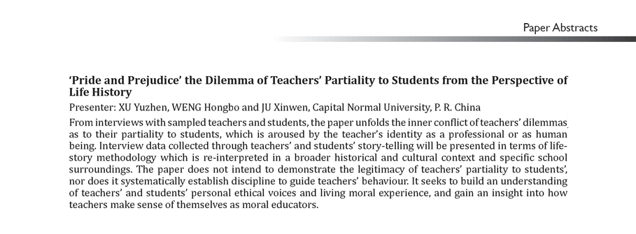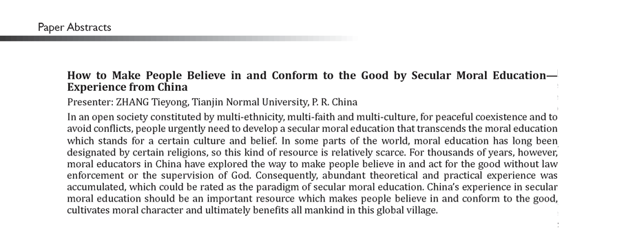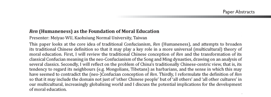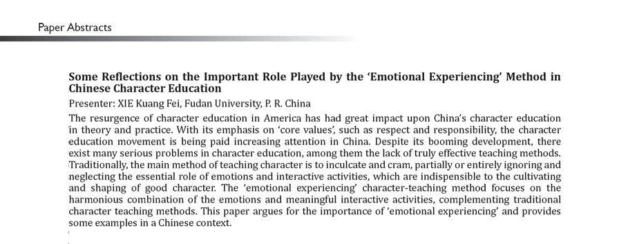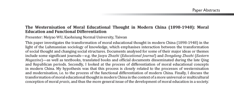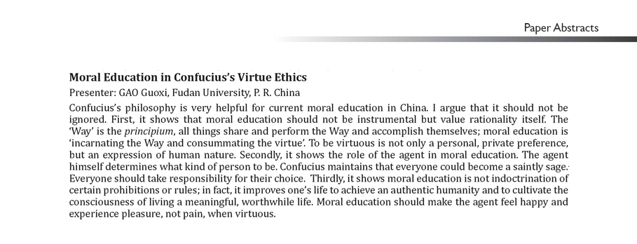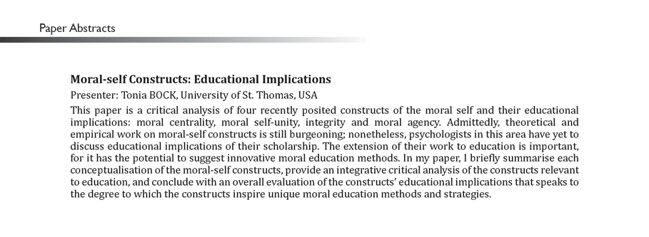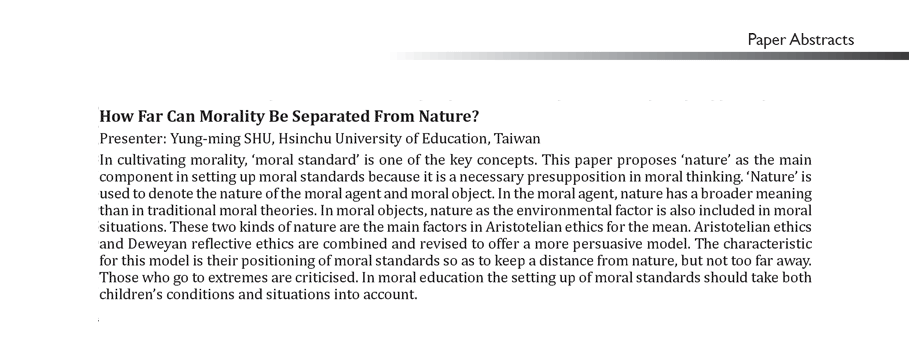 TOWARDS FULLER HUMANITY IN MORAL EDUCATION: OUR MORALE IN THE DYNAMISM OF CONCEPTION, SELF-CONSTANCY, LANGUAGE AND MORAL VALUES The Paradigm Shift and Modern Interpretation: On Chinese Traditional Moral Education LI Jia Self-constancy and Ethical Identity: Some Implications for Moral Education ZHAO Kang Understanding the Moral Aspects of Chinese Proverbs in Social Relations LIU Xuguo, WU Jiayi and LIU Jingjing Reconstructing Moral Excellence and Moral Value in Traditional Chinese Morality SHI Liushan Discussant: Rosa Hong CHEN |