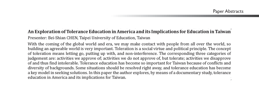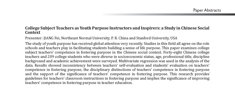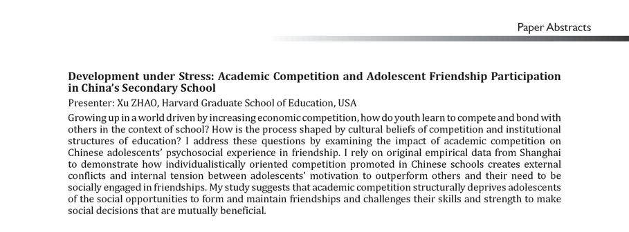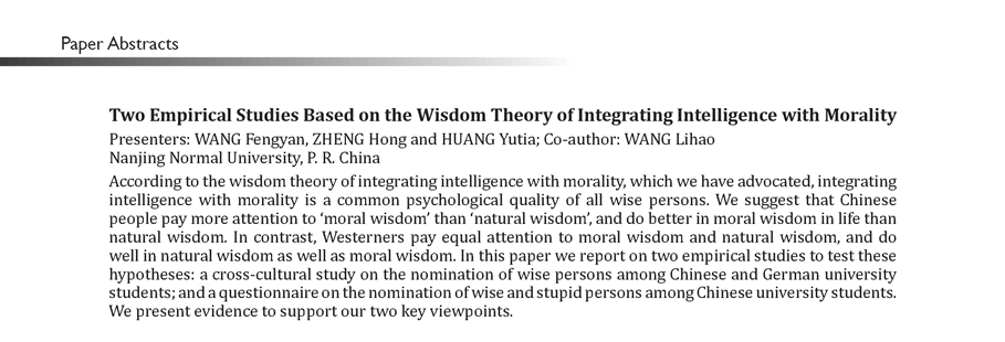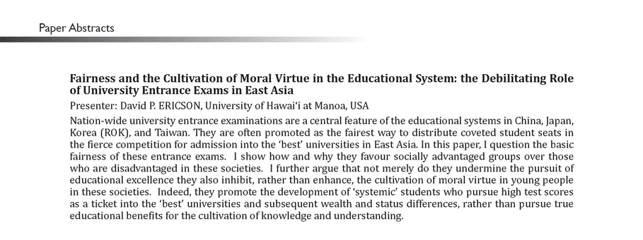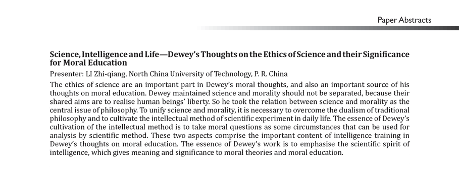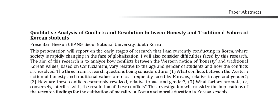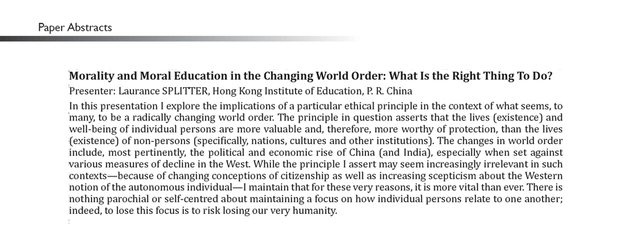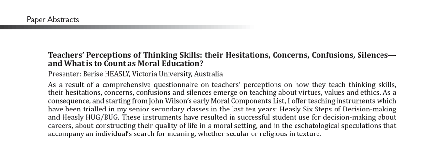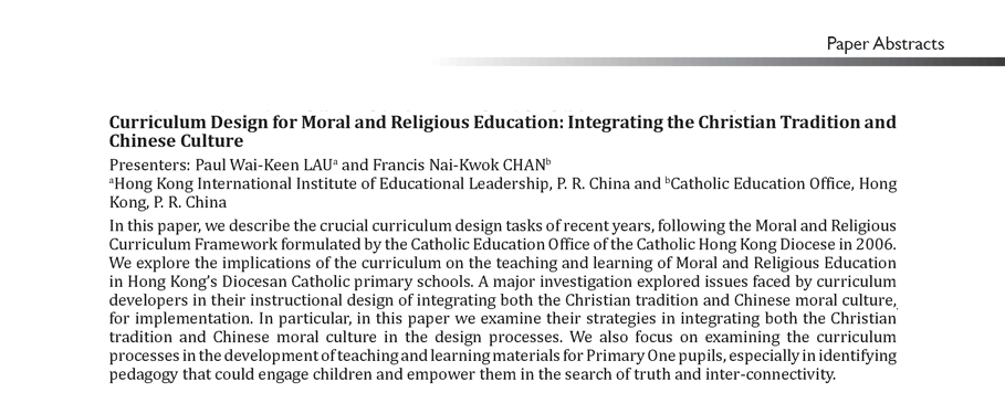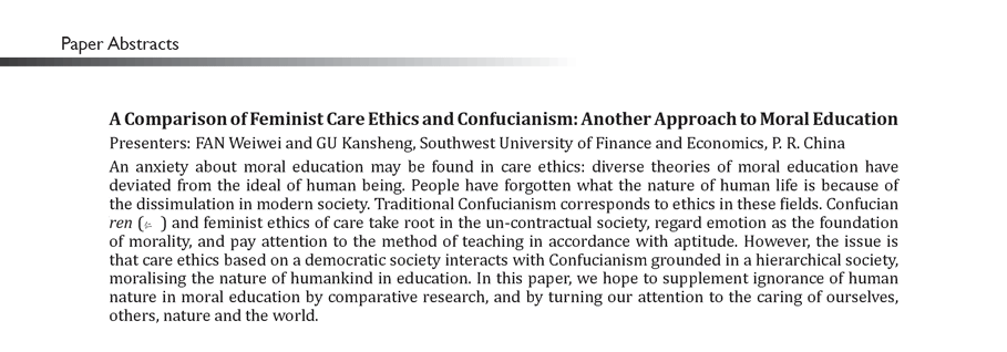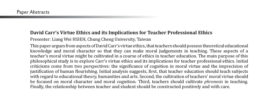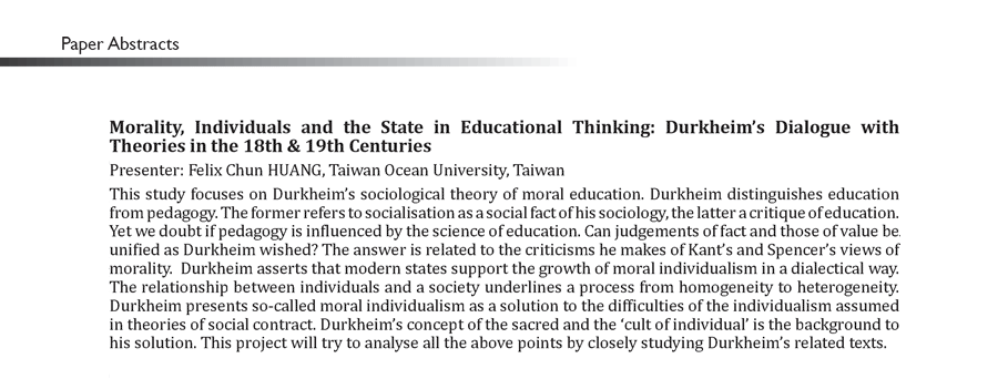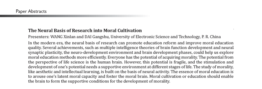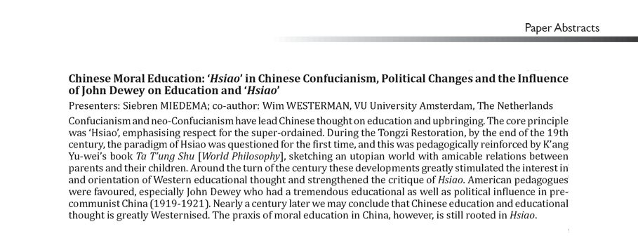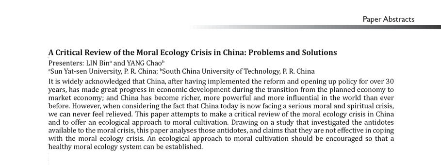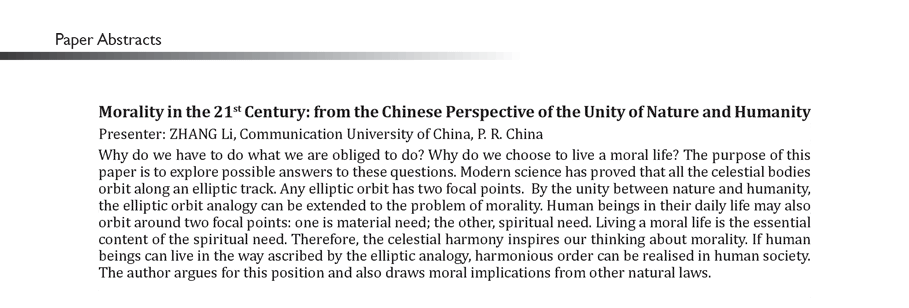 TOWARDS FULLER HUMANITY IN MORAL EDUCATION: OUR MORALE IN THE DYNAMISM OF CONCEPTION, SELF-CONSTANCY, LANGUAGE AND MORAL VALUES The Paradigm Shift and Modern Interpretation: On Chinese Traditional Moral Education LI Jia Self-constancy and Ethical Identity: Some Implications for Moral Education ZHAO Kang Understanding the Moral Aspects of Chinese Proverbs in Social Relations LIU Xuguo, WU Jiayi and LIU Jingjing Reconstructing Moral Excellence and Moral Value in Traditional Chinese Morality SHI Liushan Discussant: Rosa Hong CHEN |