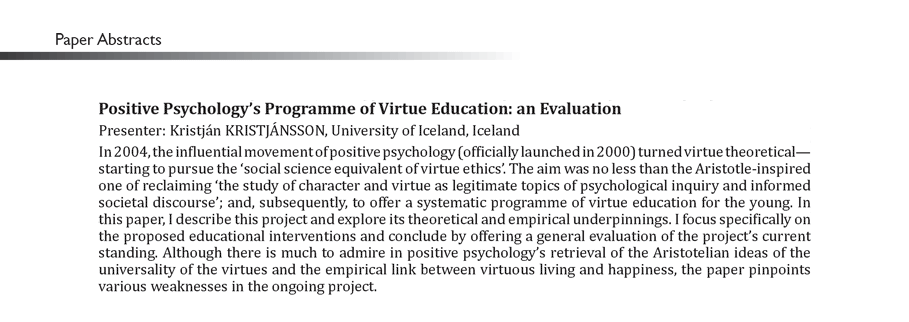 EVALUATION OF MORAL EDUCATION PROGRAMMES Positive Psychology's Programme of Virtue Education: an Evaluation Kristján KRISTJÁNSSON Character and Citizenship Education and the Development of Moral Motivation Wolfgang ALTHOF and Marvin W. BERKOWITZ What Happened to Development as the Aim of Education? Ann HIGGINS-D'ALESSANDRO |