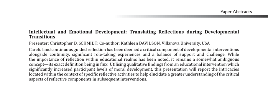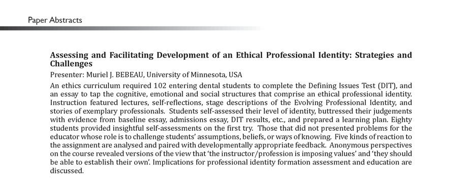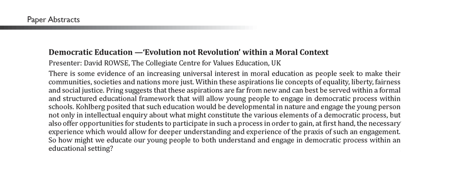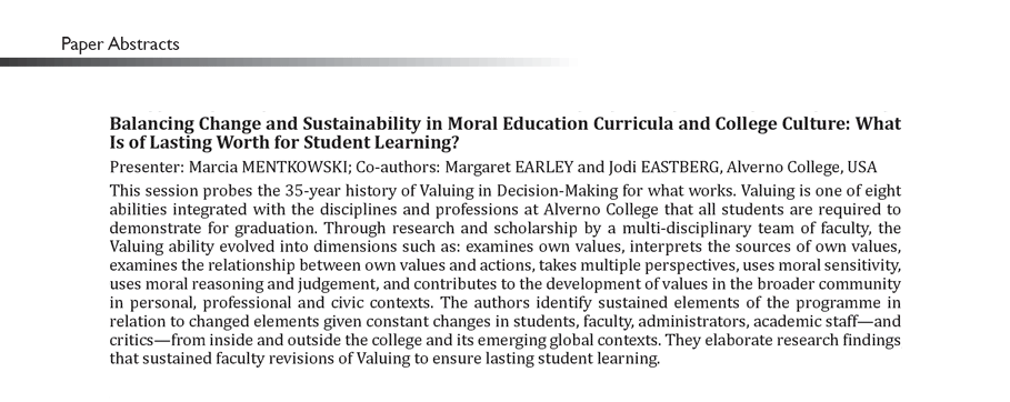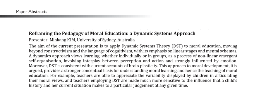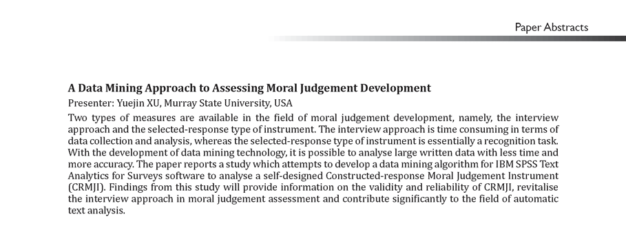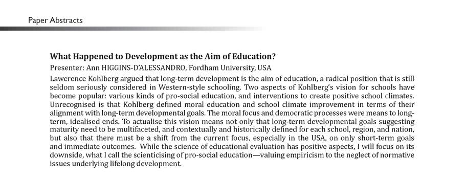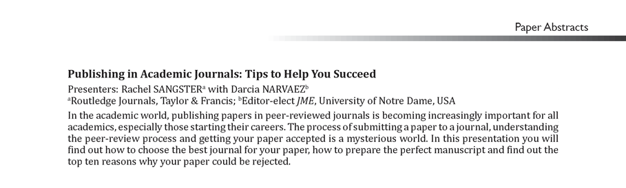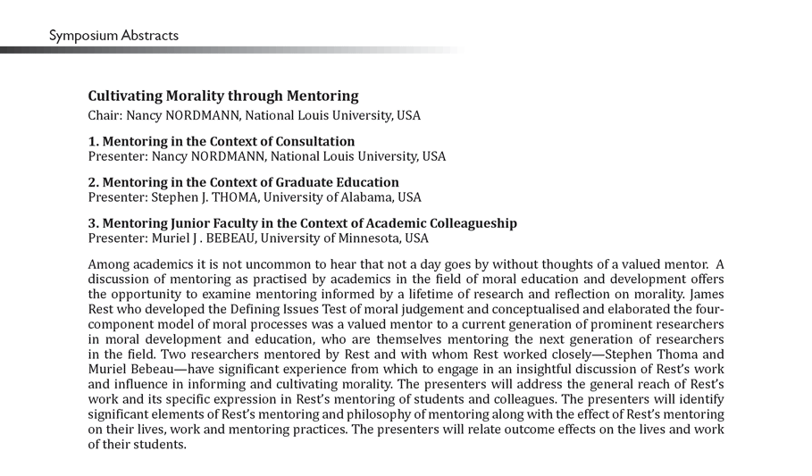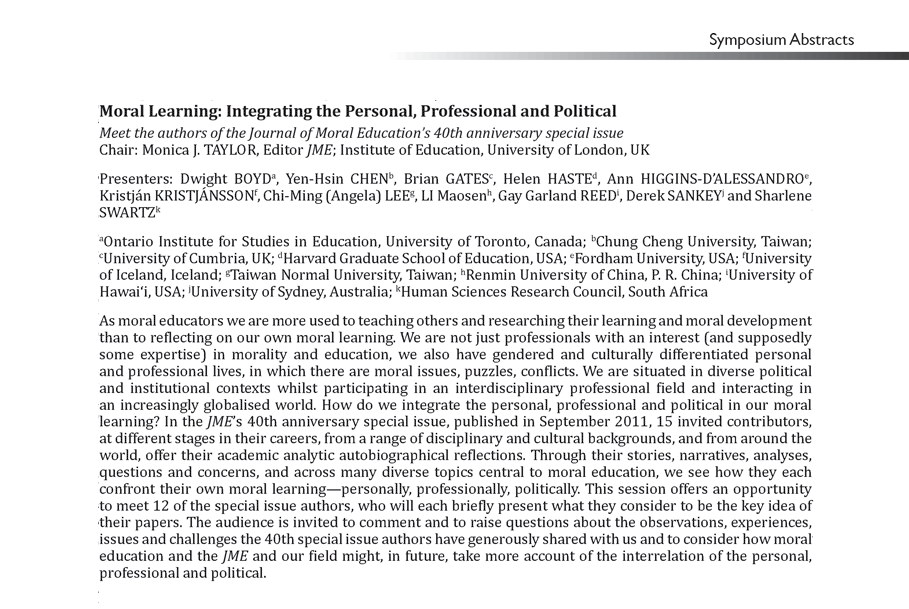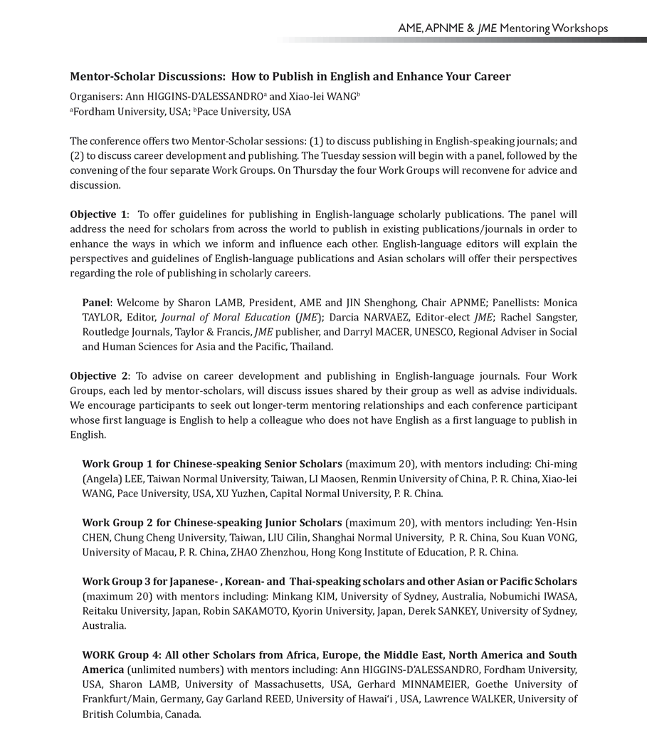 MENTOR-SCHOLAR DISCUSSIONS: HOW TO PUBLISH IN ENGLISH AND ENHANCE YOUR CAREER: PANEL AND WORKSHOP Chairs: Ann HIGGINS-D'ALESSANDRO & Xiao-lei WANG Welcome: Sharon LAMB, President, AME & JIN Shenghong, Chair APNME; Panellists: Monica TAYLOR, Editor Journal of Moral Education (JME); Darcia NARVAEZ, Editor-elect JME; Rachel SANGSTER, Routledge Journals, Taylor & Francis, JME publisher; & Darryl MACER, UNESCO Regional Adviser in Social and Human Sciences for Asia and the Pacific, Thailand |