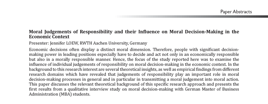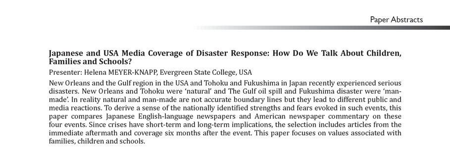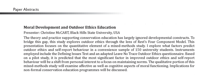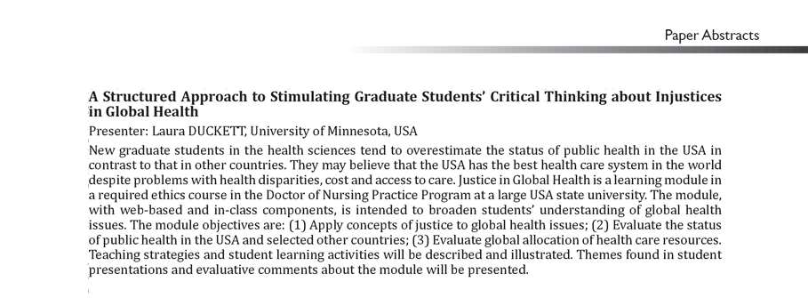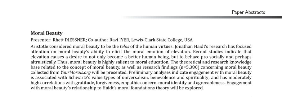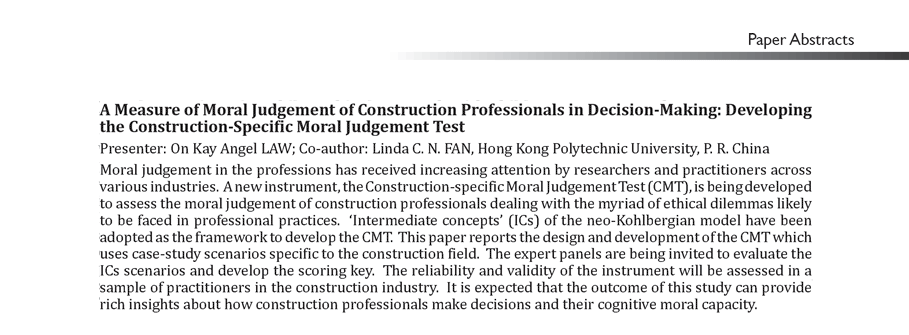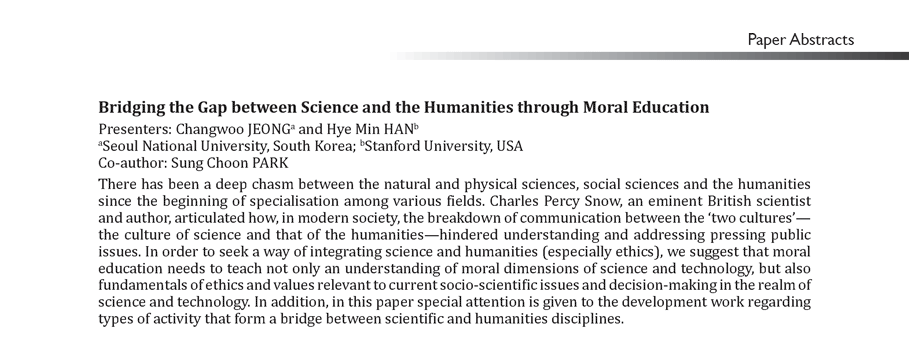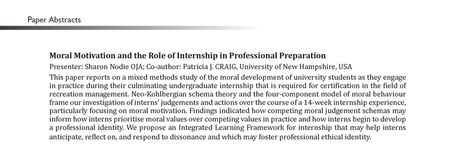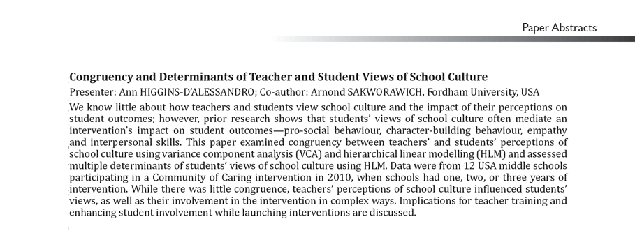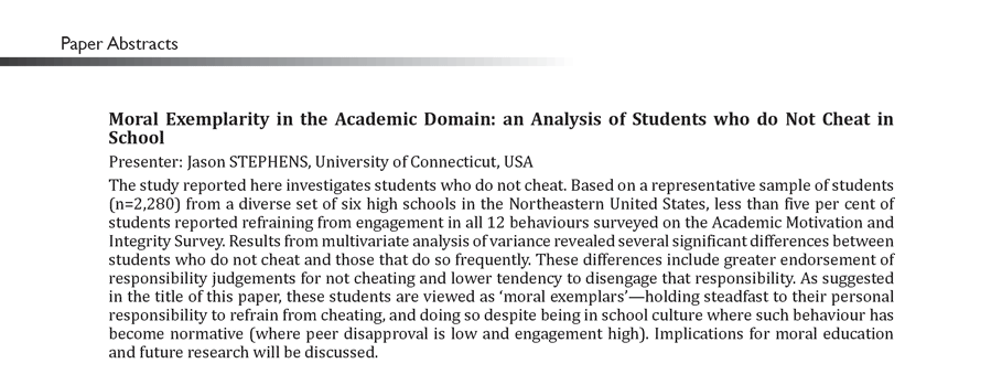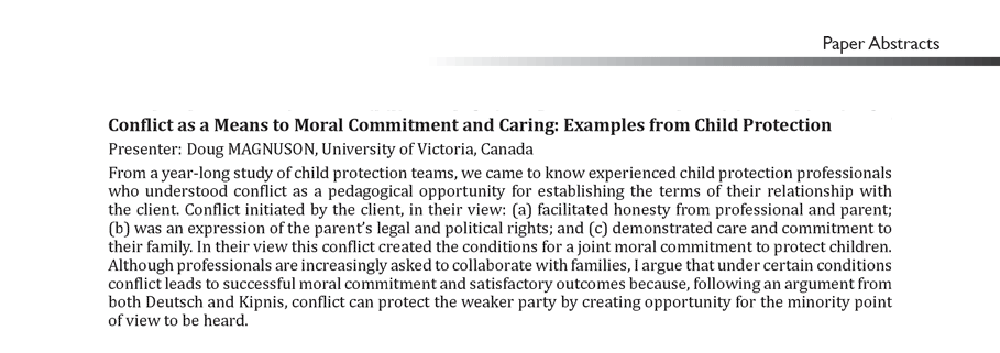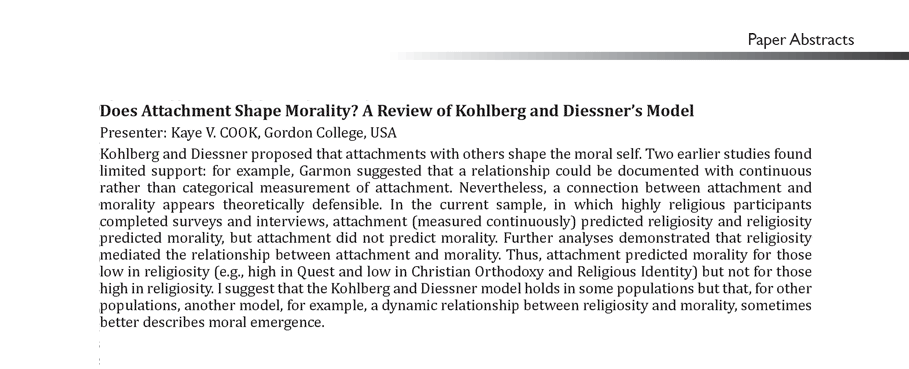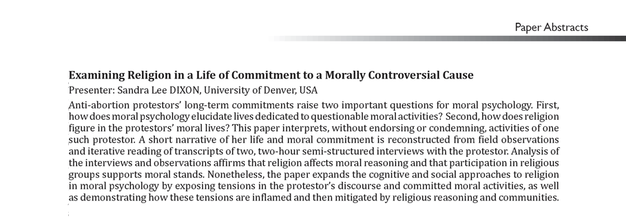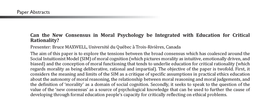 MENTOR-SCHOLAR DISCUSSIONS: HOW TO PUBLISH IN ENGLISH AND ENHANCE YOUR CAREER: PANEL AND WORKSHOP Chairs: Ann HIGGINS-D'ALESSANDRO & Xiao-lei WANG Welcome: Sharon LAMB, President, AME & JIN Shenghong, Chair APNME; Panellists: Monica TAYLOR, Editor Journal of Moral Education (JME); Darcia NARVAEZ, Editor-elect JME; Rachel SANGSTER, Routledge Journals, Taylor & Francis, JME publisher; & Darryl MACER, UNESCO Regional Adviser in Social and Human Sciences for Asia and the Pacific, Thailand |