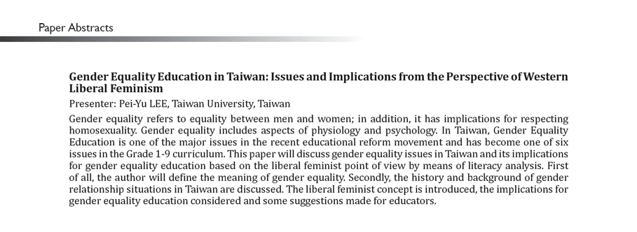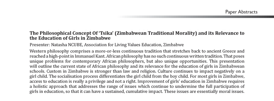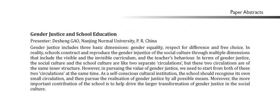 GENDER AND MORAL EDUCATION The Philosophical Concept Of ‘Tsika' (Zimbabwean Traditional Morality) and its Relevance to the Education of Girls in Zimbabwe Natalia NCUBE Gender Justice and School Education Desheng GAO Gender Equality Education in Taiwan: Issues and Implications from the Perspective of Western Liberal Feminism Pei-Yu LEE |