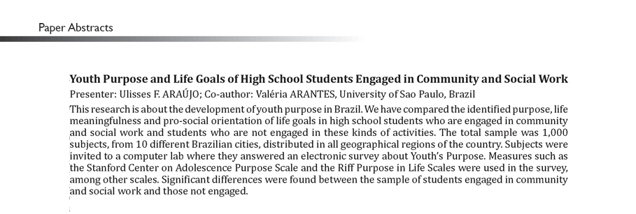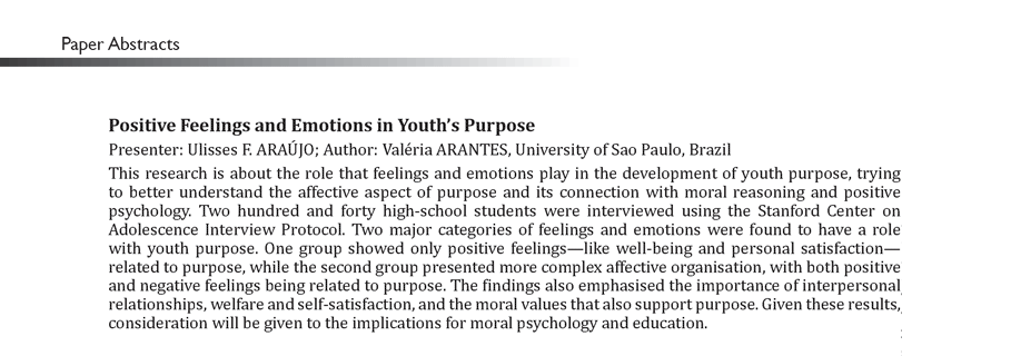 YOUTH PURPOSE: RESEARCH AND DEVELOPMENT Positive Feelings and Emotions in Youth's Purpose Ulisses F. ARAÚJO on behalf of Valéria ARANTES Youth Purpose and Life Goals of High School Students Engaged in Community and Social Work Ulisses F. ARAÚJO College Subject Teachers as Youth Purpose Instructors and Inspirers: a Study in Chinese Social Context JIANG Fei |