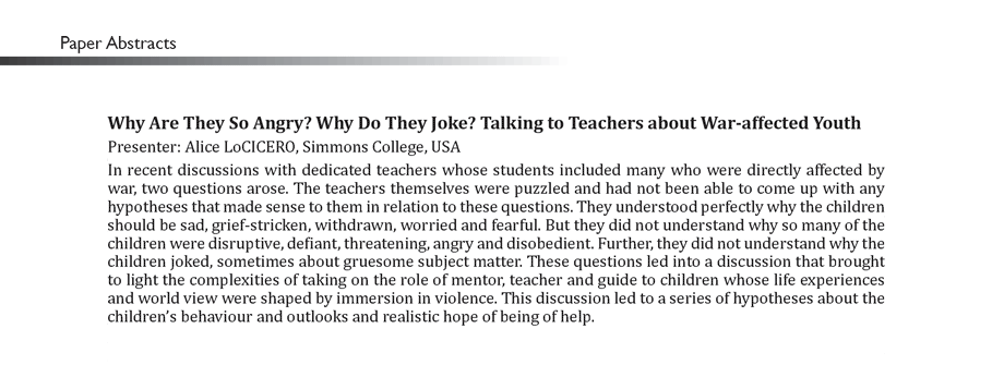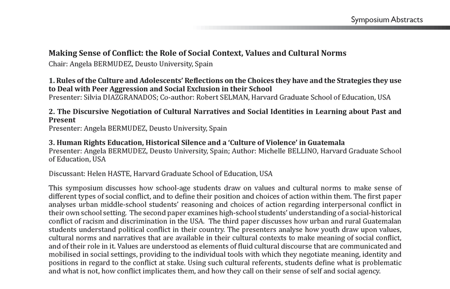 MAKING SENSE OF CONFLICT: THE ROLE OF SOCIAL CONTEXT, VALUES AND CULTURAL NORMS Rules of the Culture and Adolescents' Reflections on the Choices they have and the Strategies they use to Deal with Peer Aggression and Social Exclusion in their School Silvia DIAZGRANADOS The Discursive Negotiation of Cultural Narratives and Social Identities in Learning about Past and Present Angela BERMUDEZ Human Rights Education, Historical Silence and a ‘Culture of Violence' in Guatemala Angela BERMUDEZ Discussant: Helen HASTE |