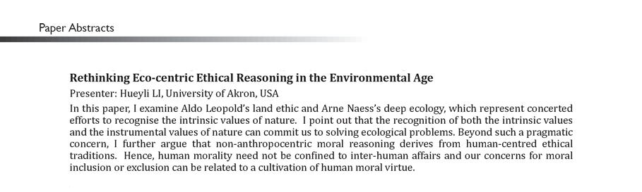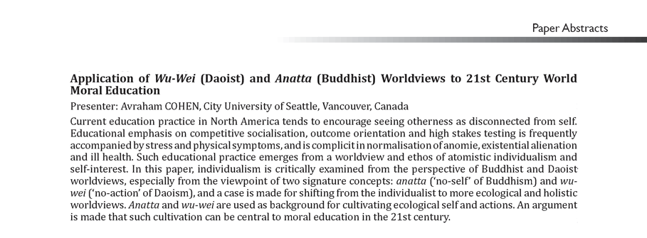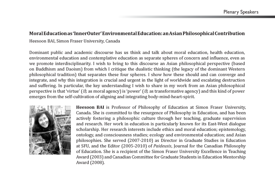 | Moral Education as ‘InnerOuter' Environmental Education: an Asian Philosophical Contribution Heesoon BAI, Professor of Philosophy of Education, Simon Fraser University, Canada Chair: Lutz ECKENSBERGER |