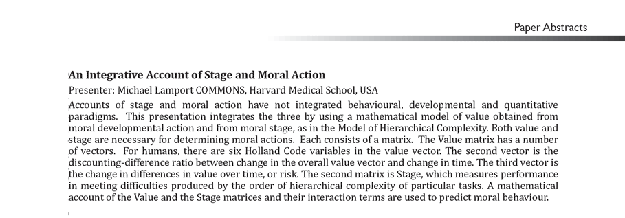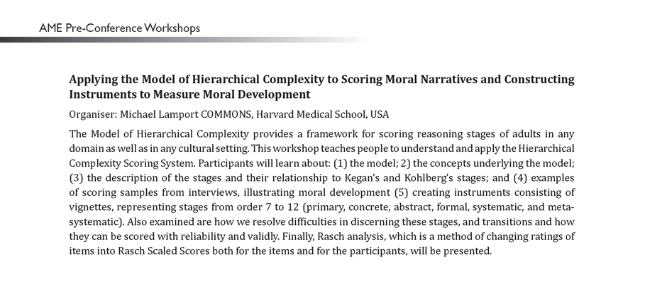 | 8:00am - 12:00 | Applying the Model of Hierarchical Complexity to Scoring Moral Narratives and Constructing Instruments to Measure Moral Development Michael Lamport COMMONS |
