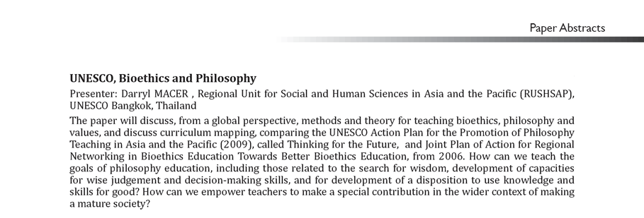 UNESCO, BIOETHICS AND PHILOSOPHY Chair and presenter: Darryl MACER |