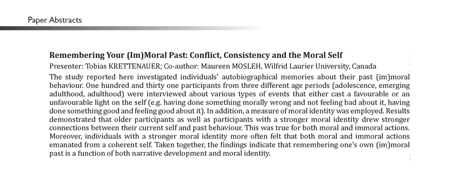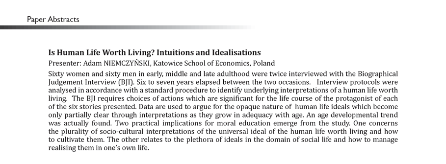 AUTOBIOGRAPHY AND MORAL DEVELOPMENT Remembering Your (Im)Moral Past: Conflict, Consistency and the Moral Self Tobias KRETTENAUER Is Human Life Worth Living? Intuitions and Idealisations Adam NIEMCZYŃSKI |