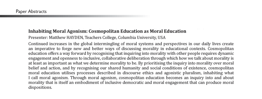 MORAL DISCOURSE Inhabiting Moral Agonism: Cosmopolitan Education as Moral Education Matthew HAYDEN Moral Education: More Than Mere Curriculum Dorothea HANCOCK |