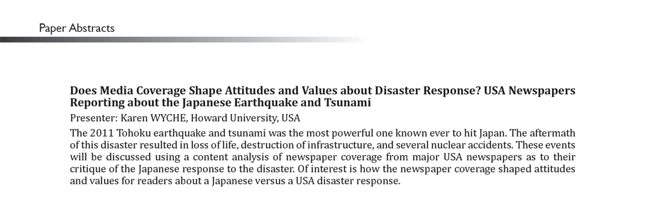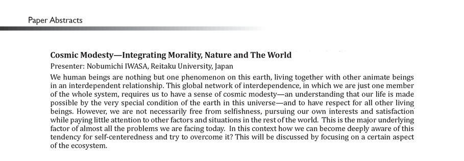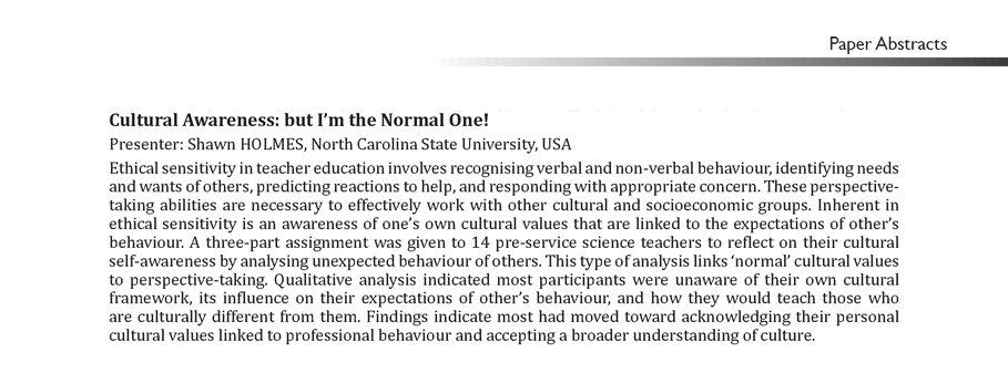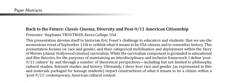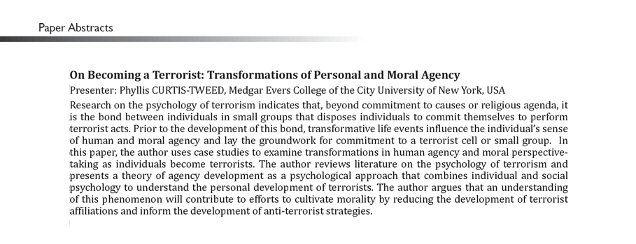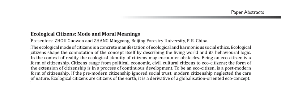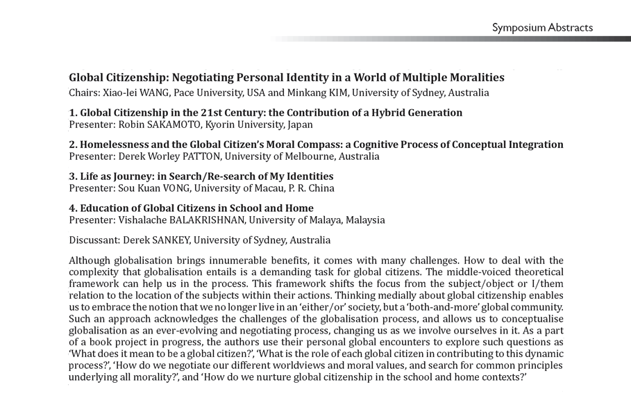 GLOBAL CITIZENSHIP: NEGOTIATING PERSONAL IDENTITY IN A WORLD OF MULTIPLE MORALITIES Global Citizenship in the 21st Century: the Contribution of a Hybrid Generation Robin SAKAMOTO Homelessness and the Global Citizen's Moral Compass: a Cognitive Process of Conceptual Integration Derek Worley PATTON Life as Journey: in Search/Re-search of My Identities Sou Kuan VONG Education of Global Citizens in School and Home Vishalache BALAKRISHNAN Discussant: Derek SANKEY |