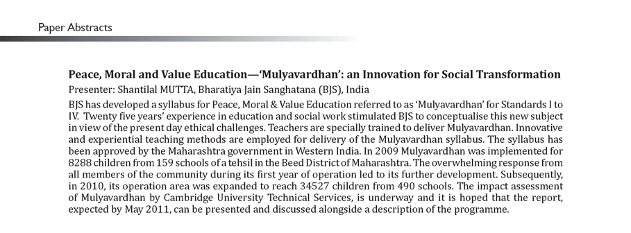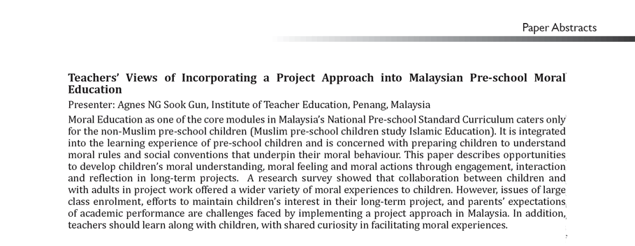 MORAL EDUCATION IN PRACTICE Teachers' Views of Incorporating a Project Approach into Malaysian Pre-school Moral Education Agnes NG Sook Gun Peace, Moral and Value Education—‘Mulyavardhan': an Innovation for Social Transformation Shantilal MUTTA |