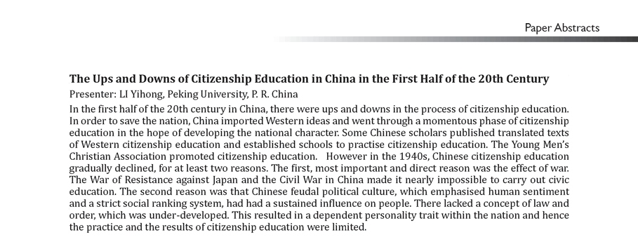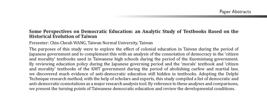 TEXTBOOKS AND HISTORY The Ups and Downs of Citizenship Education in China in the First Half of the 20th Century LI Yihong Some Perspectives on Democratic Education: an Analytic Study of Textbooks Based on the Historical Evolution of Taiwan Chin-Cheuh WANG |