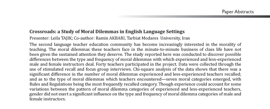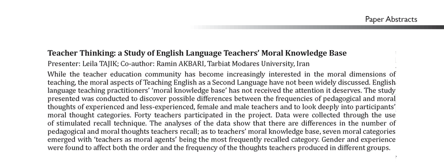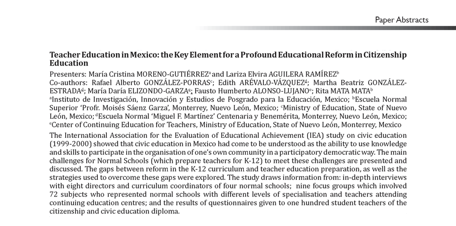 MORALITY OF TEACHING AND TEACHERS' AWARENESS Crossroads: a Study of Moral Dilemmas in English Language Settings Leila TAJIK Cultural Awareness: but I'm the Normal One! Shawn HOLMES Teacher Education in Mexico: the Key Element for a Profound Educational Reform in Citizenship Education María Cristina MORENO-GUTIÉRREZ and Lariza Elvira AGUILERA RAMÍREZ |