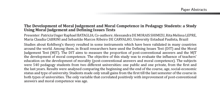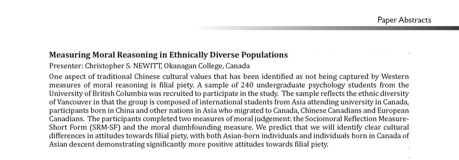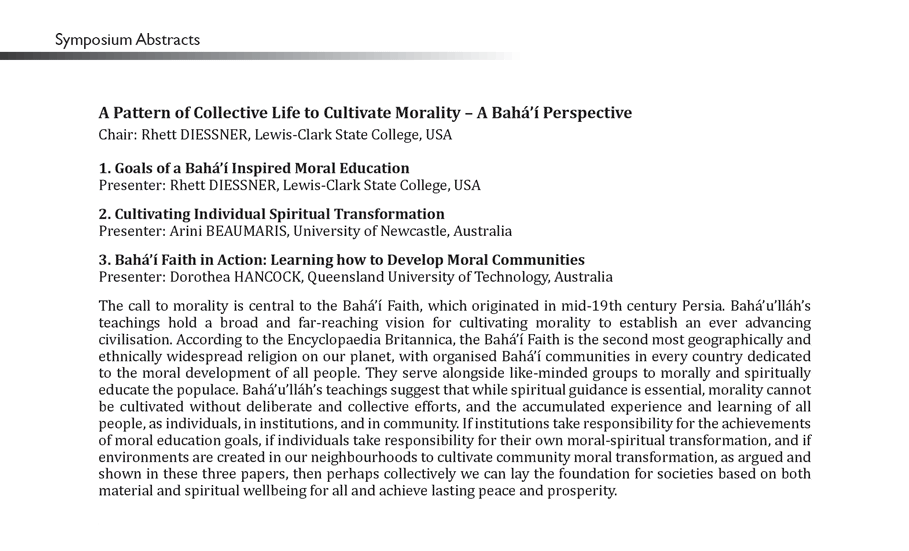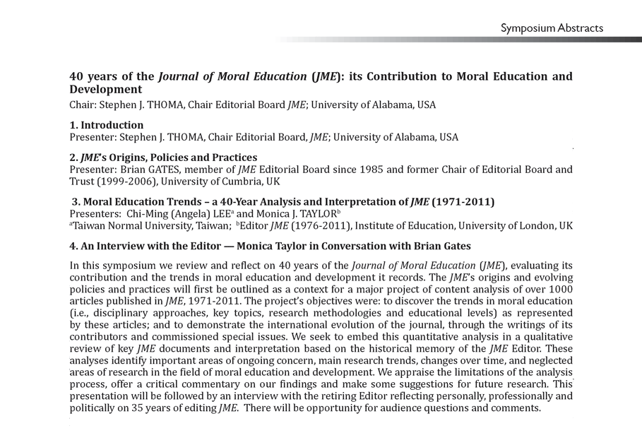 | Cultivating Morality: Reflections, Inspirations, anticipations AME: Sharon LAMB Chinese Moral Education and Associations: JIN Shenghong Asia-Pacific Region: Chi-Ming (Angela) LEE JME: Stephen J. THOMA Chair: James CONROY |