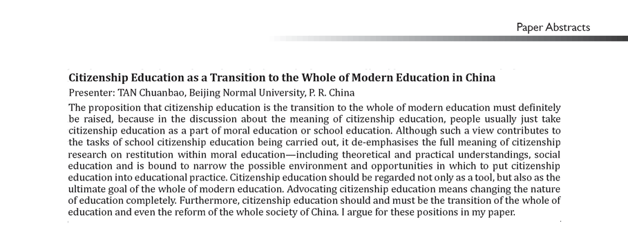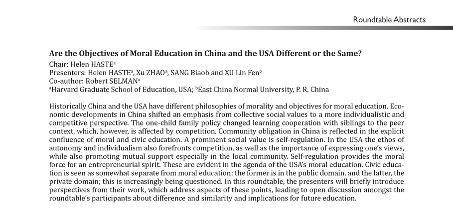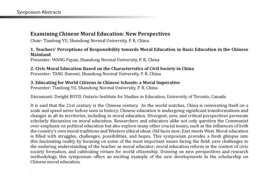 EXAMINING CHINESE MORAL EDUCATION: NEW PERSPECTIVES Teachers' Perceptions of Responsibility towards Moral Education in Basic Education in the Chinese Mainland WANG Fuyan Civic Moral Education Based on the Characteristics of Civil Society in China TANG Hanwei Educating for World Citizens in Chinese Schools: a Moral Imperative Tianlong YU Discussant: Dwight BOYD |
