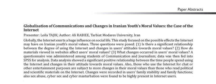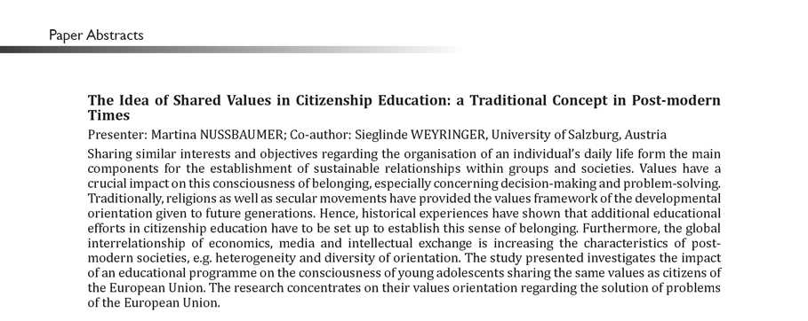 YOUTH VALUES Culture, Development and Adolescence—Towards a Theory and History of Adolescence Boris ZIZEK The Idea of Shared Values in Citizenship Education: a Traditional Concept in Post-modern Times Martina NUSSBAUMER Globalisation of Communications and Changes in Iranian youth's Moral Values: the Case of the Internet Leila TAJIK on behalf of Ali RABIEE |