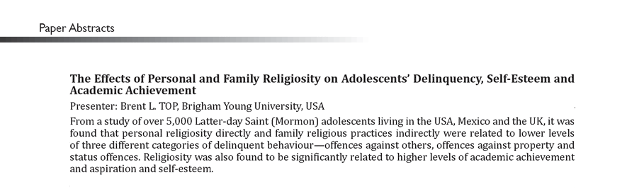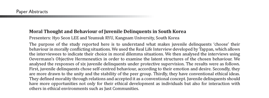 MORAL BEHAVIOUR Parent-Child Relationships and the Development of Moral Mindsets and Aggressive Behaviour Jenny L. VAYDICH and Darcia NARVAEZ The Effects of Personal and Family Religiosity on Adolescents' Delinquency, Self-Esteem and Academic Achievement Brent L. TOP Moral Thought and Behaviour of Juvenile Delinquents in South Korea Hyo Seon LEE and Yeunsuk RYU |