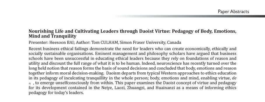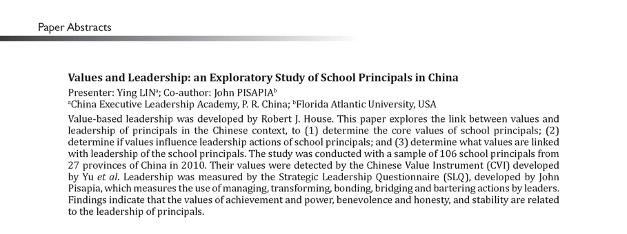 THE MORALITY AND VALUES OF LEADERS School Administrators' Perceptions of their Role in the Implementation of Character Education in a Taiwanese Primary School Yen-Hsin CHEN and Ming-Dih LIN Values and Leadership: an Exploratory Study of School Principals in China Ying LIN Nourishing Life and Cultivating Leaders through Daoist Virtue: Pedagogy of Body, Emotions, Mind and Tranquility Heesoon BAI on behalf of Tom Culham |