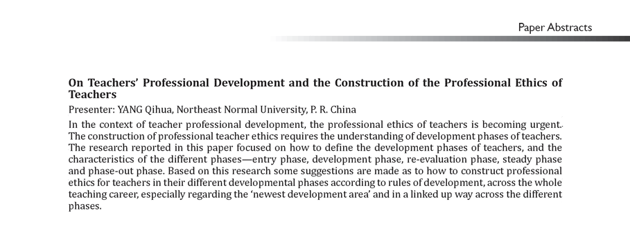 TEACHER PROFESSIONAL ETHICS David Carr's Virtue Ethics and its Implications for Teacher Professional Ethics Liang Wei HSIEH On Teachers' Professional Development and the Construction of the Professional Ethics of Teachers YANG Qihua Teacher Morality in Mainland China: Evolution and Characteristics—A Policy Text Analysis Lijia WANG |