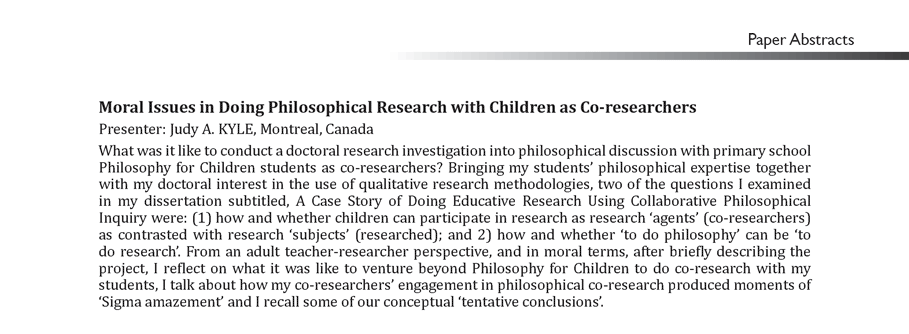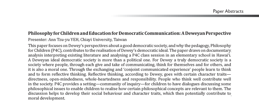 PHILOSOPHY WITH CHILDREN AND THINKING SKILLS Philosophy for Children and Education for Democratic Communication: a Deweyan Perspective Ann Tzu-yu YEH Moral Issues in Doing Philosophical Research with Children as Co-researchers Judy A. KYLE Teachers' Perceptions of Thinking Skills: their Hesitations, Concerns, Confusions, Silences—and What is to Count as Moral Education? Berise HEASLY |