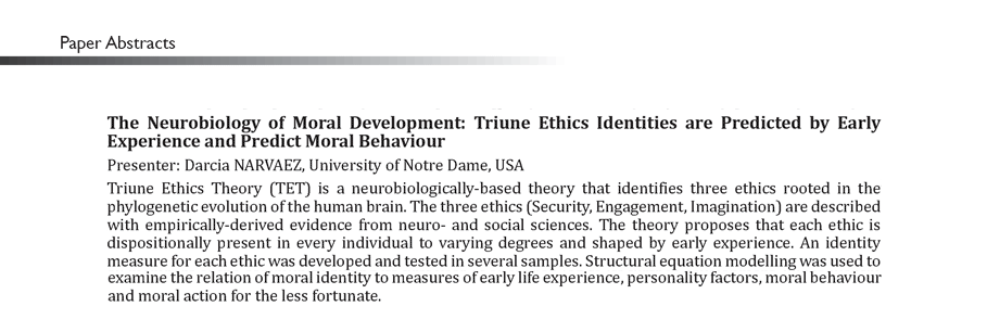 THE BRAIN AND EARLY CHILDHOOD The Neurobiology of Moral Development: Triune Ethics Identities are Predicted by Early Experience and Predict Moral Behaviour Darcia NARVAEZ Reframing the Pedagogy of Moral Education: a Dynamic Systems Approach Minkang KIM Cultivating Morality in Early Childhood Arini BEAUMARIS |