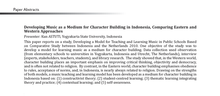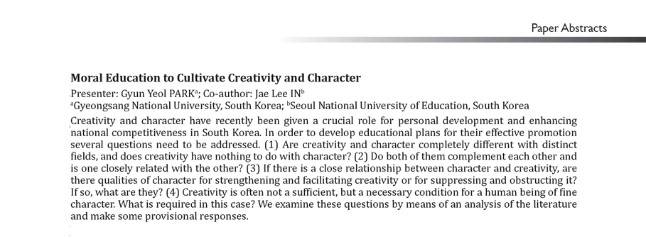 CREATIVITY, AESTHETICS AND CHARACTER DEVELOPMENT Moral Education to Cultivate Creativity and Character Presenter: Gyun Yeol PARK Developing Music as a Medium for Character Building in Indonesia, Comparing Eastern and Western Approaches Kun Setyaning ASTUTI An Ethics Class Taught in a Workshop Style in Japan Tetsu UENO |