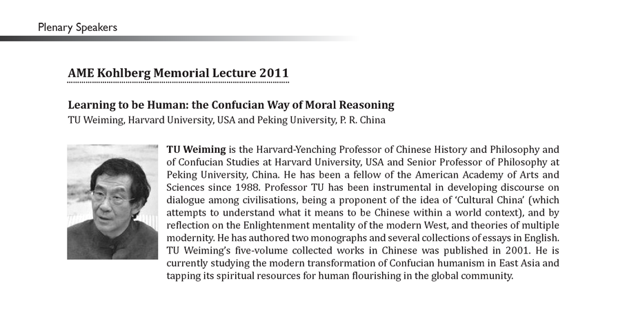 | Learning to be Human: the Confucian Way of Moral Reasoning TU Weiming Harvard-Yenching Professor of Chinese History and Philosophy and of Confucian Studies at Harvard University, USA and Senior Professor of Philosophy at Peking University, Beijing, China Chair: JIN Shenghong |