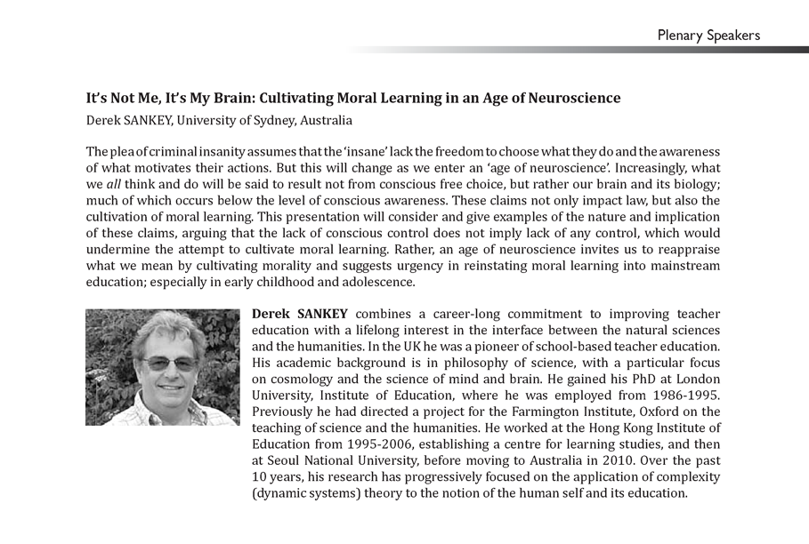 | It's Not Me, It's My Brain: Cultivating Moral Learning in an Age of Neuroscience Derek SANKEY, University of Sydney, Australia Chair: Xiao-lei WANG |