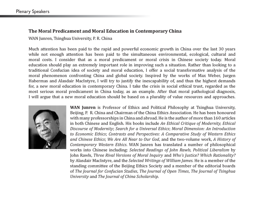 | The Moral Predicament and Moral Education in Contemporary China Sponsored by the Philosophy of Education Society of Great Britain WAN Junren, Professor of Ethics and Political Philosophy, Tsinghua University, Beijing, P. R. China and Chairman of the China Ethics Association Chair: Robert DAVIS |