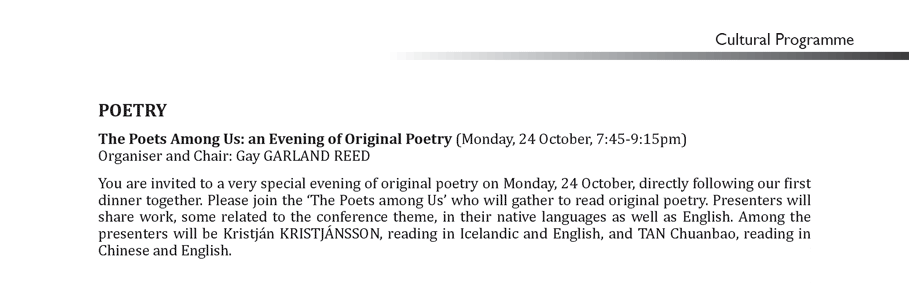 | 7:45pm - 9:15pm | The Poets among Us: an Evening of Original Poetry Facilitator: Gay Garland REED |