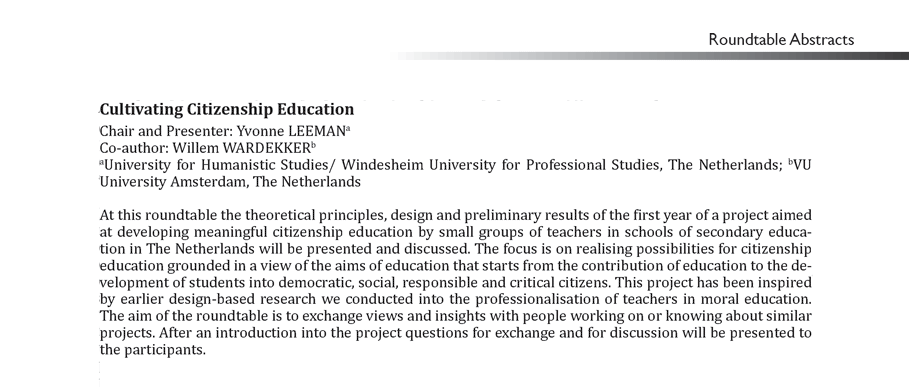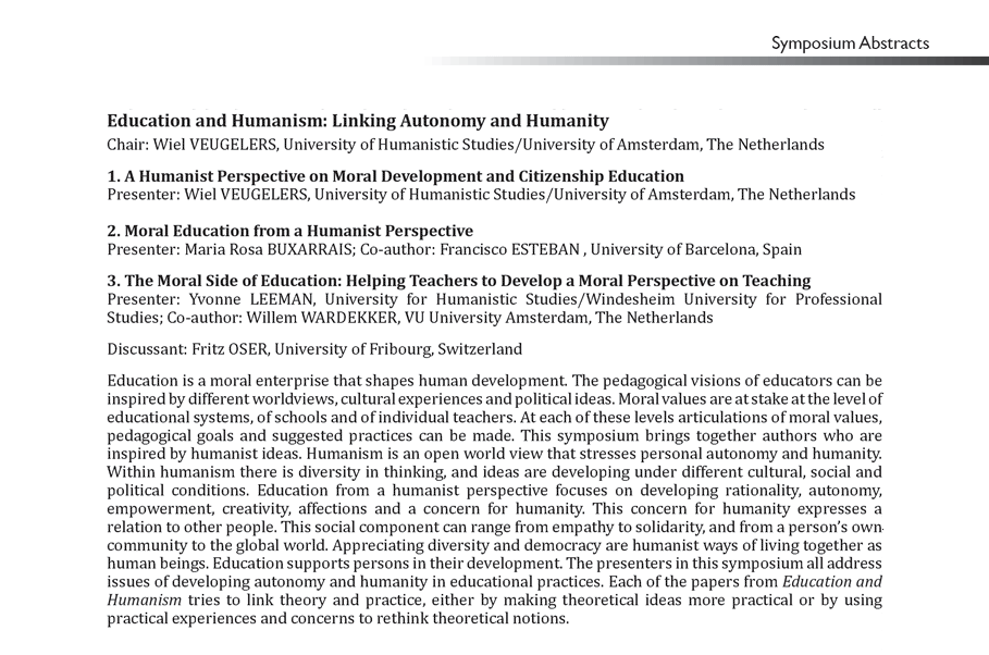 EDUCATION AND HUMANISM: LINKING AUTONOMY AND HUMANITY A Humanist Perspective on Moral Development and Citizenship Education Wiel VEUGELERS Moral Education from a Humanist Perspective Maria Rosa BUXARRAIS The Moral Side of Education: Helping Teachers to Develop a Moral Perspective on Teaching Yvonne LEEMAN Discussant: Fritz OSER |