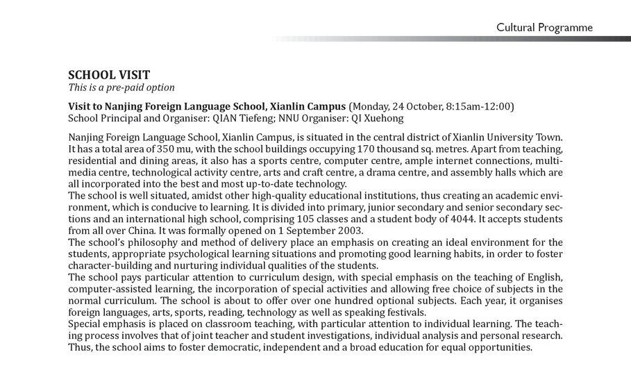 | 8:30am - 12:00 | Visit to Nanjing Foreign Language School, Xianlin Campus Pre-registered option |