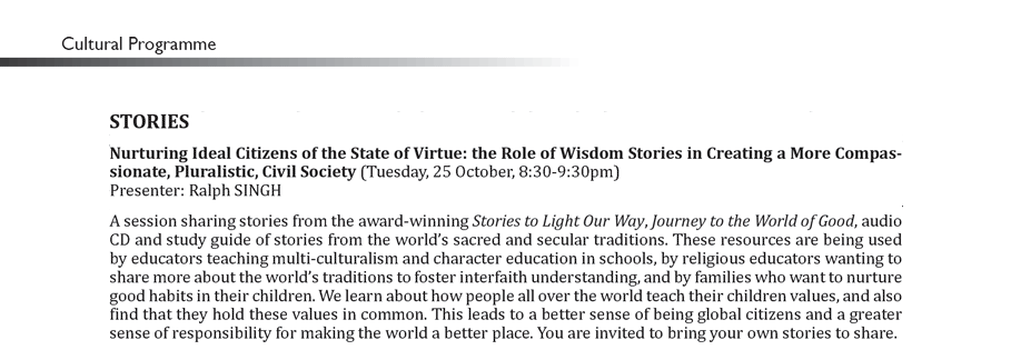 | 8:30pm - 9:30pm | Nurturing Ideal Citizens of the State of Virtue: the Role of Wisdom Stories in Creating a More Compassionate, Pluralistic, Civil Society Presenter: Ralph SINGH |