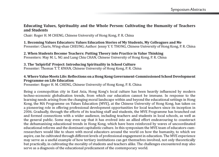 EDUCATING VALUES, SPIRITUALITY AND THE WHOLE PERSON: CULTIVATING THE HUMANITY OF TEACHERS AND STUDENTS Becoming Values Educators: Values Education Stories of My Students, My Colleagues and Me Charis Wing-shan CHEUNG on behalf of Jenny Y. Y. THONG When Students Become Teachers: Putting Theory into Practice in Value Thinking May M. L. NG and Lung Chiu CHAN The ‘InSpirEd' Project: Introducing Spirituality in School Culture Thomas T. T. KWAN Where Value Meets Life: Reflections on a Hong Kong Government-Commissioned School Development Programme on Life Education Roger H. M. CHENG |