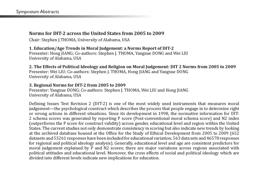 NORMS FOR DIT-2 ACROSS THE UNITED STATES FROM 2005 To 2009 Education/Age Trends in Moral Judgement: a Norms Report of DIT-2 Hong JIANG The Effects of Political Ideology and Religion on Moral Judgement: DIT 2 Norms from 2005 to 2009 Wei LIU Regional Norms for DIT-2 from 2005 to 2009 Yangxue DONG |