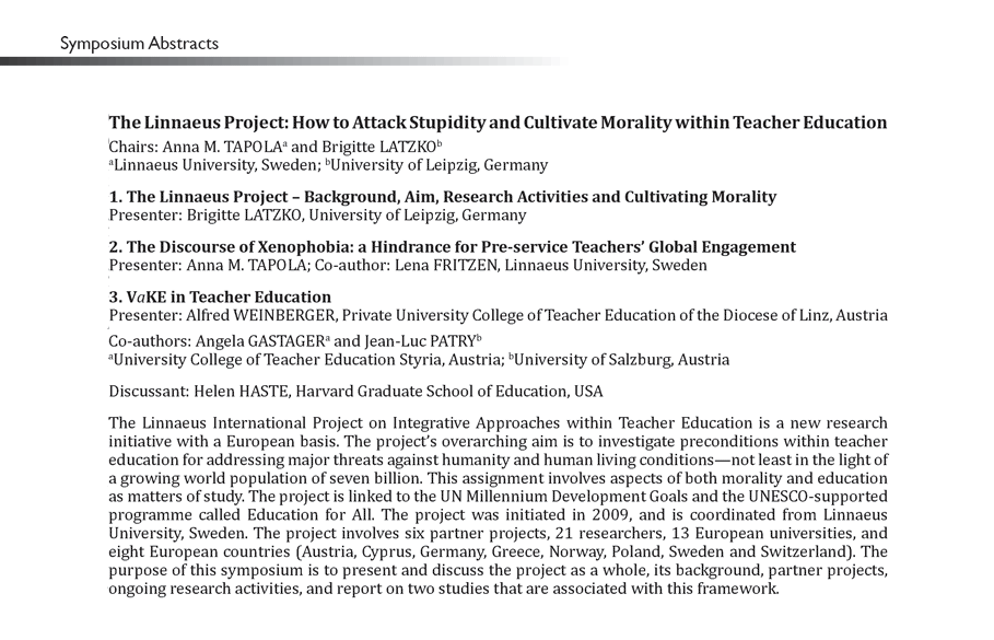 THE LINNAEUS PROJECT: HOW TO ATTACK STUPIDITY AND CULTIVATE MORALITY WITHIN TEACHER EDUCATION The Linnaeus Project – Background, Aim, Research Activities and Cultivating Morality Brigitte LATZKO The Discourse of Xenophobia: a Hindrance for Pre-service Teachers' Global Engagement Anna M. TAPOLA VaKE in Teacher Education Alfred WEINBERGER Discussant: Helen HASTE |