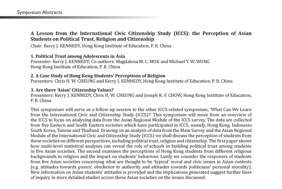 A LESSON FROM THE INTERNATIONAL CIVIC CITIZENSHIP STUDY (ICCS): THE PERCEPTION OF ASIAN STUDENTS ON POLITICAL TRUST, RELIGION AND CITIZENSHIP Political Trust among Adolescents in Asia Kerry J. KENNEDY A Case Study of Hong Kong Students' Perceptions of Religion Chris CHEUNG and Kerry J. KENNEDY Are there ‘Asian' Citizenship Values? Kerry J. KENNEDY, Chris CHEUNG and Joseph K. F. CHOW |
