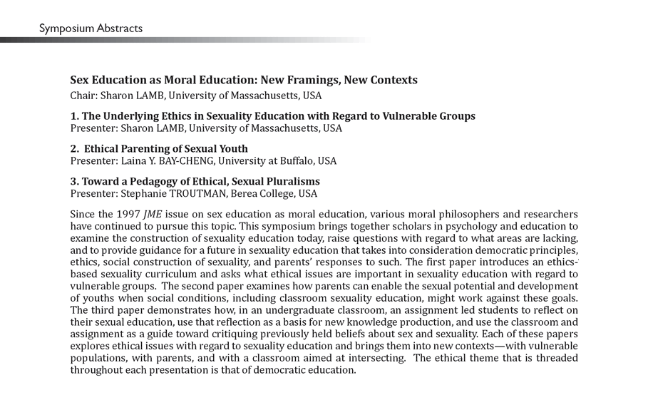 SEX EDUCATION AS MORAL EDUCATION: NEW FRAMINGS, NEW CONTEXTS The Underlying Ethics in Sexuality Education with Regard to Vulnerable Groups Sharon LAMB Ethical Parenting of Sexual Youth Laina Y. BAY-CHENG Toward a Pedagogy of Ethical, Sexual Pluralisms Stephanie TROUTMAN |