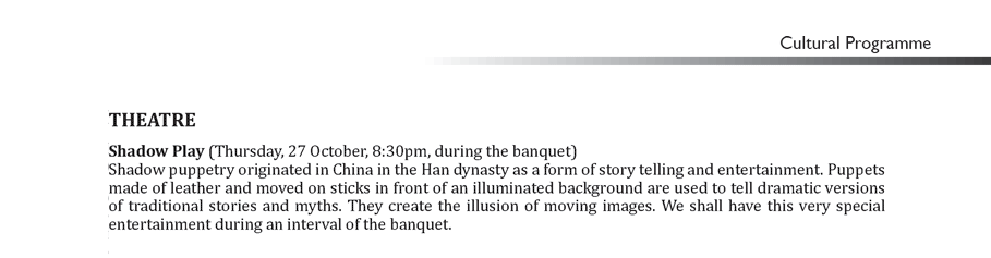 | 7:30pm - 9:30pm | Chinese Banquet with Shadow Play sponsored by Nanjing Normal University |
