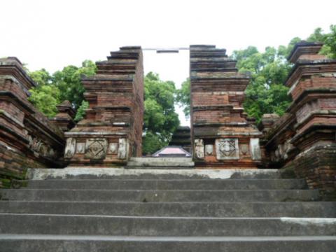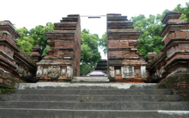 Ratu Boko (associated with the legendary King Boko) is a few kilometres from Prambanan and situated on a hilltop that offers a view of Prambanan against a backdrop of the volcanic Mount Merapi. As an archaeological site it appears to comprise an ancient royal palace complex, similar in architectural layout with other Kratons or palaces in Java, together with Hindu and Buddhist architectural temple elements and indications that it also may have served to contain a Buddhist monastery.